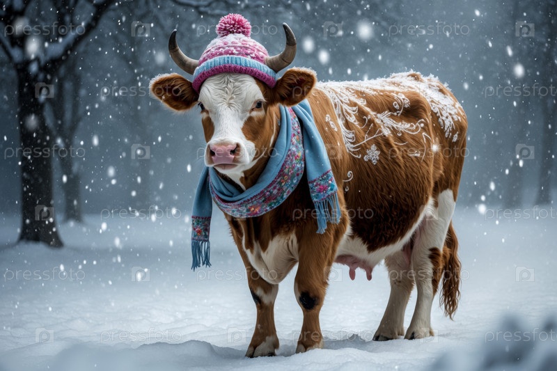 ИИ генеративный портрет коровы в вязанной зимней одежде шляпа и шарф, животное во снежных дождях зимой