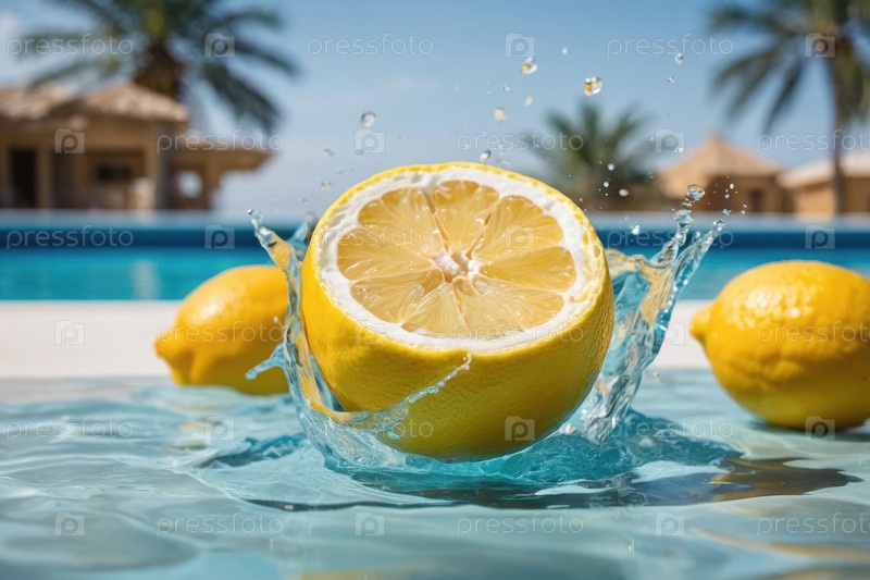 Экзотические фрукты лимон в распыленной воде летом бассейн праздничный фон AI Generative