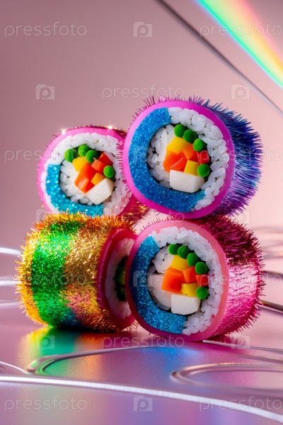 Abstract необычное творческое искусство суши рулон фруктов декоративная радуга блеск фантастическая еда генеративное ИИ