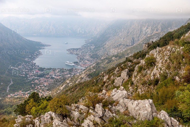 Вид с канатного автомобиля на залив Бока-Котор, большой туристический лайнер, припаркованный среди гор
