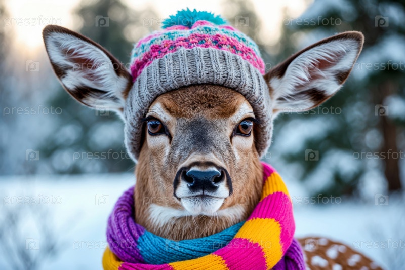 Портрет оленя в вязанной зимней одежде шляпы и шарфа, животное в снежных дождях зимой AI Generative
