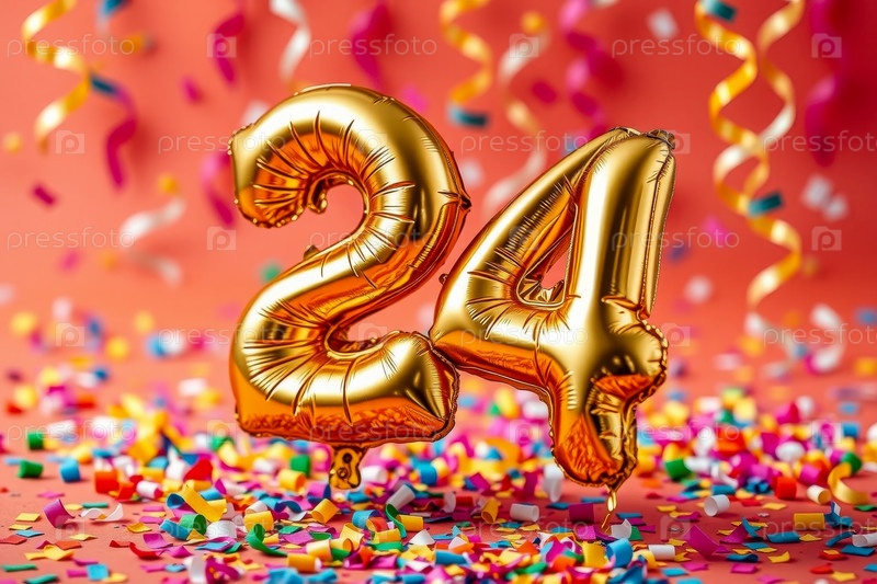 Гелиевый день рождения шарик формы номер двадцать четыре, золотые буквы фигура 24 праздник праздничный фон