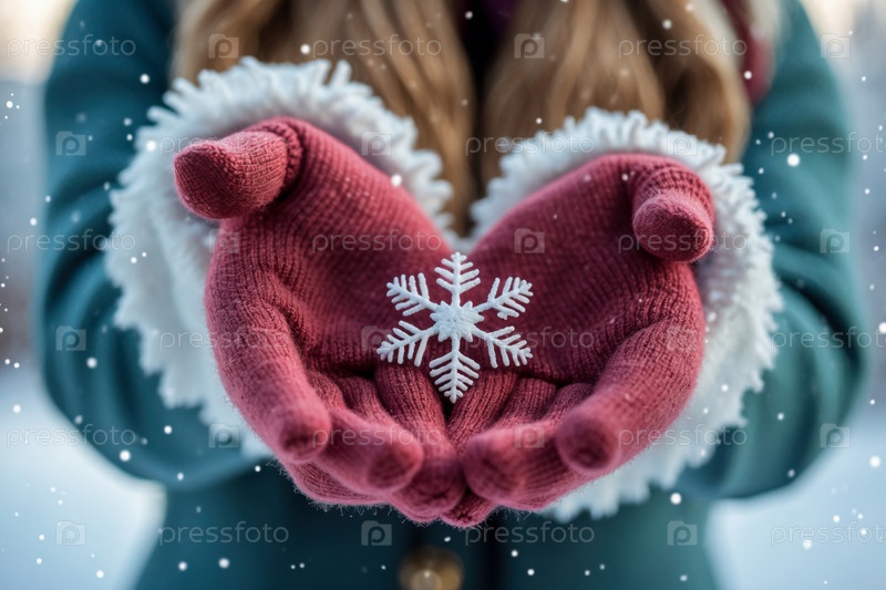 Женщина, держащая снежинку в руках в перчатках. Рождественская Новый Год Зимняя Карта ИИ-генерированная