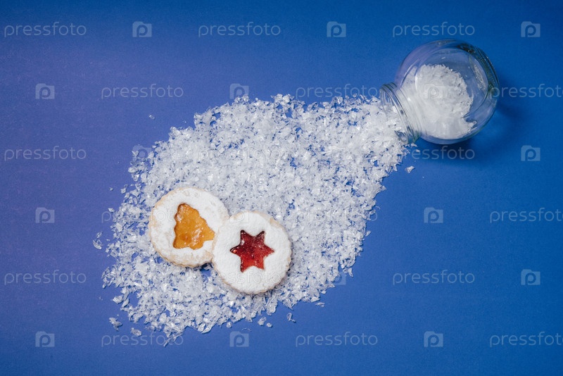 Домашние десертные печенье печенье на снегу снегопады голубой фон, Новый год Рождество натюрморт вдохновение
