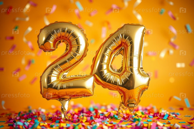 Гелиевый день рождения шарик формы номер двадцать четыре, золотые буквы фигура 24 праздник праздничный фон
