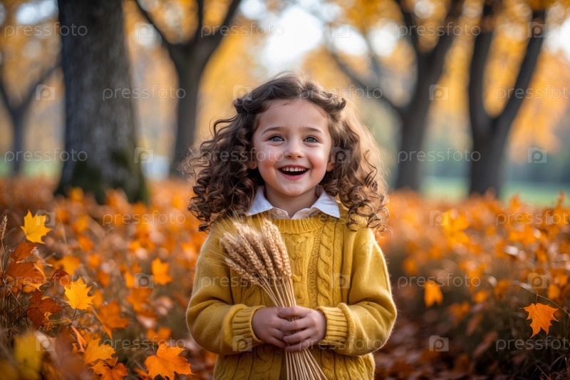 Портрет милой маленькой девочки на фоне осеннего падения листьев в парке, атмосферы леса и искусственного интеллекта