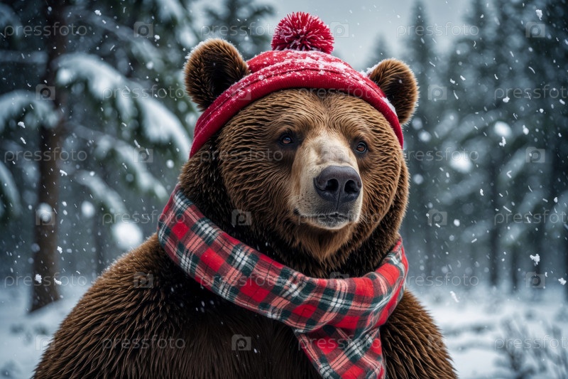 Генеративный портрет медведя в вязанной зимней одежде шляпе и шарфе, животное при снегопаде зимой AI