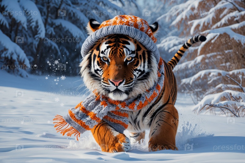 AI Generative Портрет тигра в вязанной зимней одежде шляпе и шарфе, животное в снежных дождях зимой