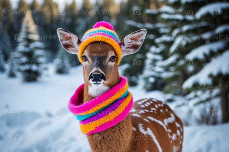 Портрет оленя в вязанной зимней одежде шляпы и шарфа, животное в снежных дождях зимой AI Generative