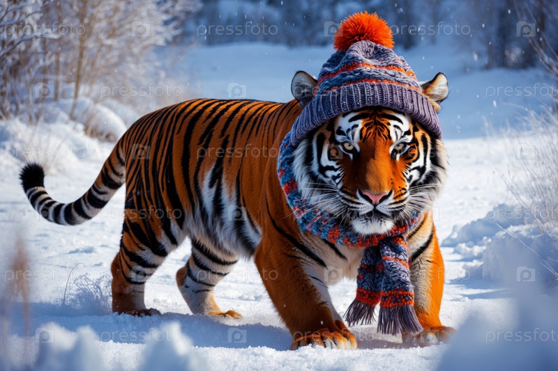 AI Generative Портрет тигра в вязанной зимней одежде шляпе и шарфе, животное в снежных дождях зимой