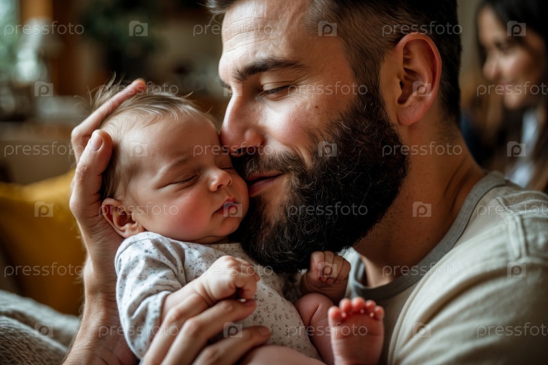 ИИ генеративный семейный портрет папа и новорожденный ребенок, мужчина и ребенок обнимаются в гостиной дома