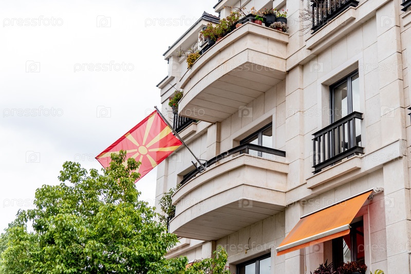 Национальный флаг независимого государства Северная Македония повесить флагшток на уличном здании