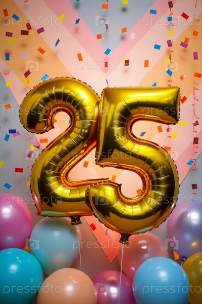 Гелийный день рождения шарик формы номер двадцать пять, золотая буква фигура 25 праздник праздничный фон