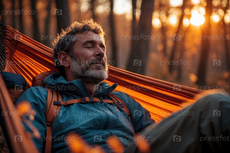 Портрет мужчина турист в гамаке на фоне осенний лист опускается в парке лесная природа ИИ генеративный