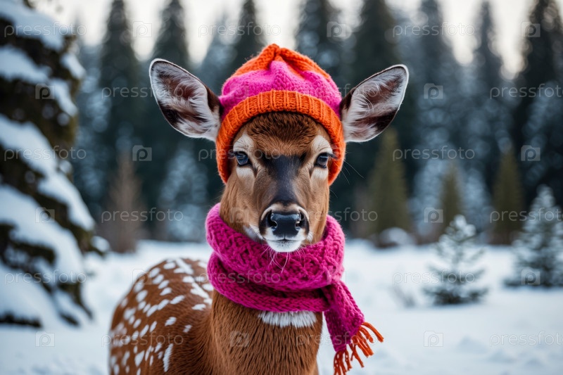 Портрет оленя в вязанной зимней одежде шляпы и шарфа, животное в снежных дождях зимой AI Generative