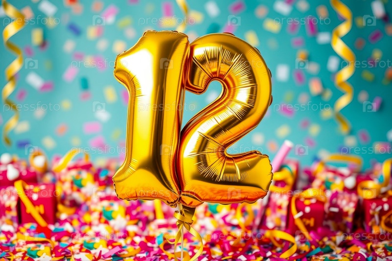 Гелиевый баллон на день рождения в форме числа двенадцать, фигура с золотой буквой 12 на фоне праздничного торжества