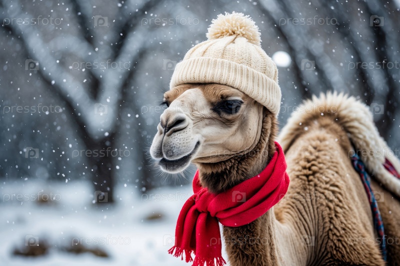 Портрет верблюда в вязанной зимней одежде шляпы и шарфа, животное в снежных дождях зимой AI Generative