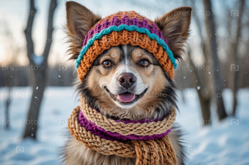 Портрет собаки-домашнего животного в вязанной зимней одежде, шляпе и шарфе, животное в снежных дождях зимой AI Generative