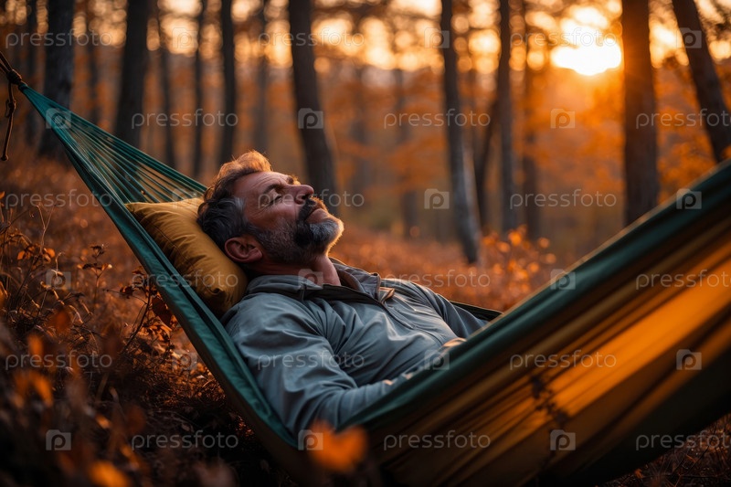 Портрет мужчина турист в гамаке на фоне осенний лист опускается в парке лесная природа ИИ генеративный