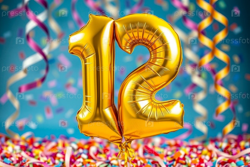 Гелиевый баллон на день рождения в форме числа двенадцать, фигура с золотой буквой 12 на фоне праздничного торжества