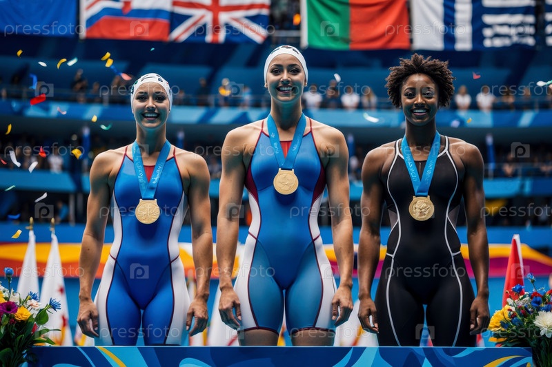 Награждение победителей чемпионов по спорту плавать в бассейне, летние Олимпийские игры соревнования AI Generative