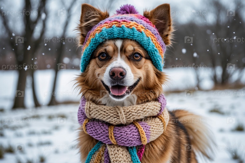 AI Generative Собака портрет питомца в вязанной зимней одежде шляпе и шарфе, животное в снежных дождях зимой