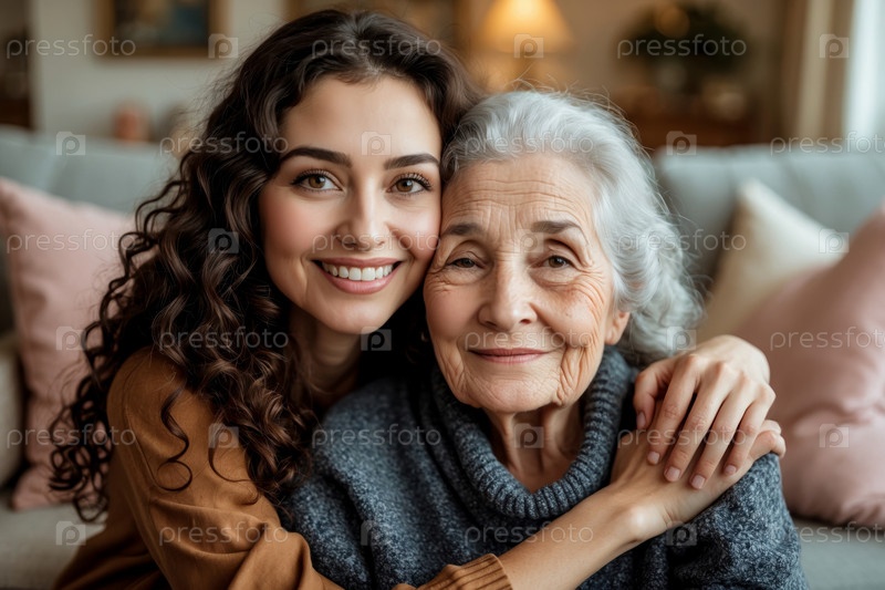 AI Generative Family Portrait бабушка и внучка, пожилая женщина и девочка обнимаются в гостиной