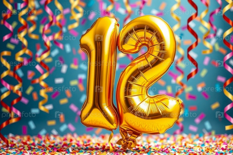 Гелиевый баллон на день рождения в форме числа двенадцать, фигура с золотой буквой 12 на фоне праздничного торжества