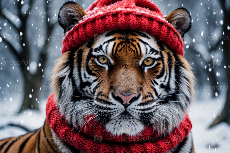 AI Generative Портрет тигра в вязанной зимней одежде шляпе и шарфе, животное в снежных дождях зимой