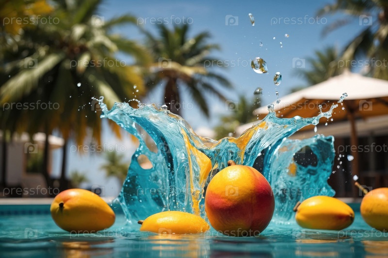 AI Generative Экзотические фрукты манго в распыленной воде на летнем бассейне отдых фоном
