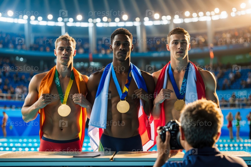 Награждение победителей чемпионов по спорту плавать в бассейне, летние Олимпийские игры соревнования AI Generative