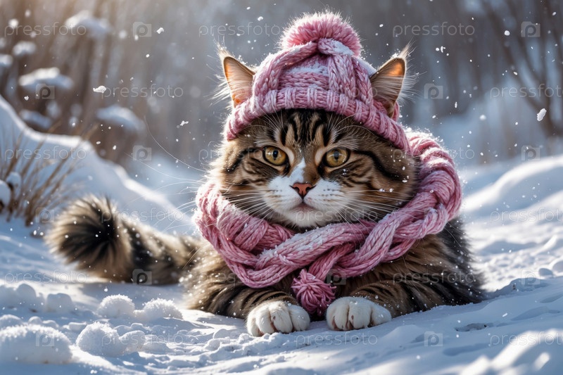 AI Generative Портрет кошки в вязанной зимней одежде шляпе и шарфе, животное в снежных дождях зимой