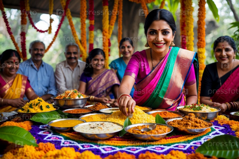 AI Generative People семья индуисты за традиционным обеденным столом празднуют Угади Югада Новый год в первый день месяца Чайтра