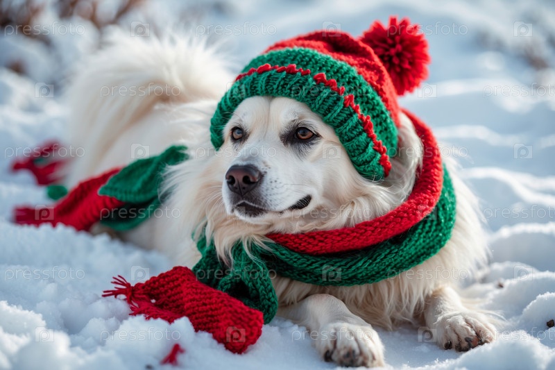 AI Generative Портрет собаки в вязанной зимней одежде шляпы и шарфа, животное в снежных дождях зимой