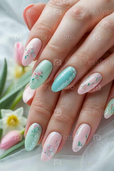 Тематический весенний маникюр в ярких пастельных розовых цветах с праздничными цветочными узорами AI Generative