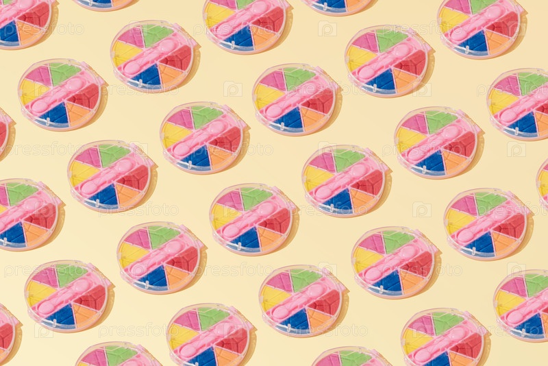 Творческий абстрактный косметический макияж оттенков глаз узора плоский лежит на пастельно-желтом фоне минимализм