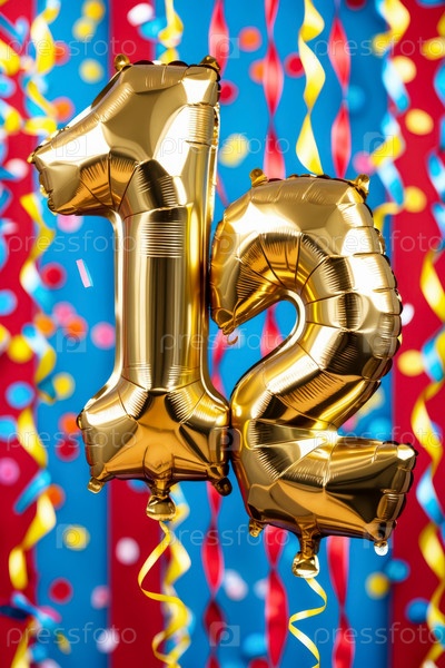 Гелиевый день рождения шарик формы номер двенадцать, золотые буквы фигура 12 праздник праздничный фон