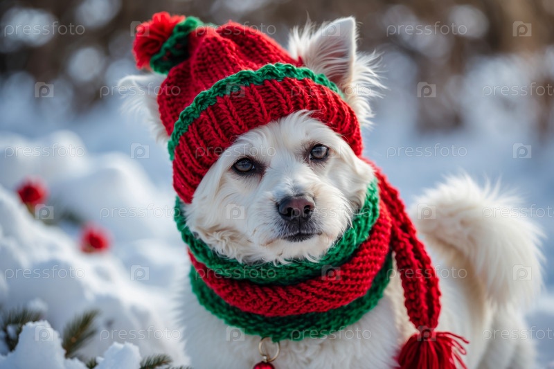 Портрет собаки в вязанной зимней одежде шляпы и шарфа, животное в снежных дождях зимой AI Generative