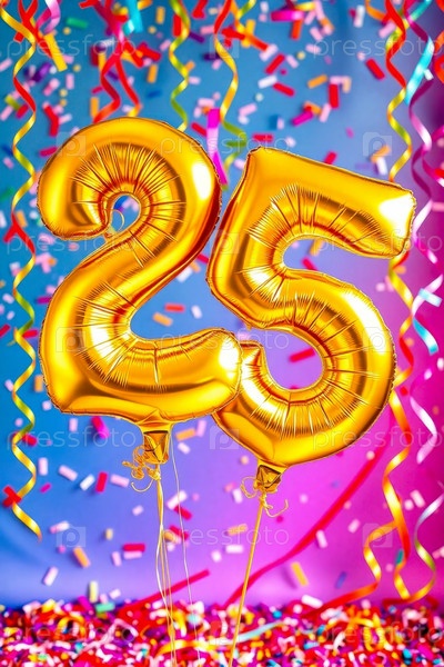 Гелийный день рождения шарик формы номер двадцать пять, золотая буква фигура 25 праздник праздничный фон