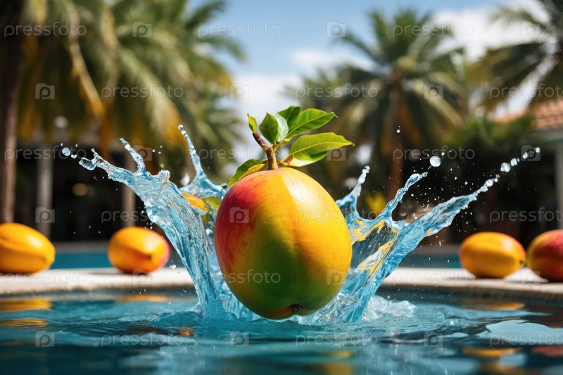 AI Generative Экзотические фрукты манго в распыленной воде на летнем бассейне отдых фоном