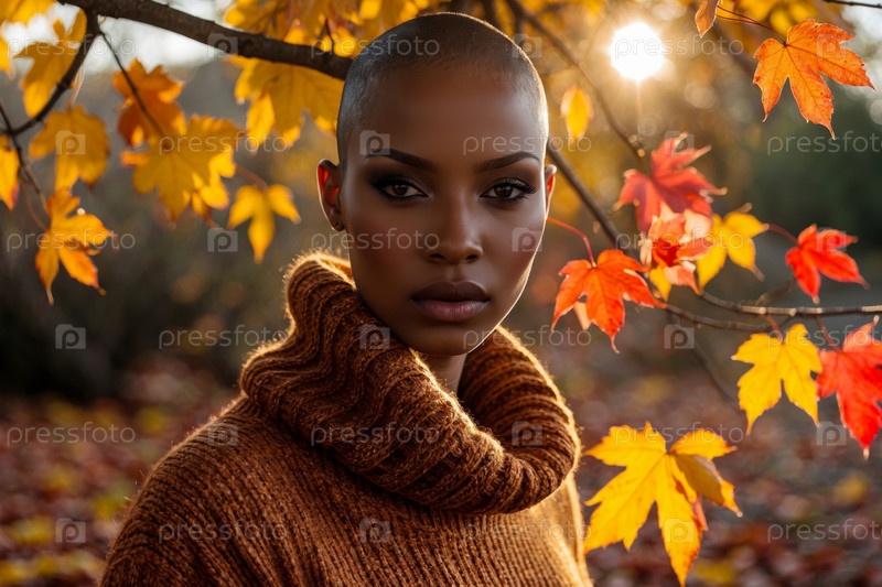 Портрет молодой женщины с короткой стрижкой на фоне осеннего падения листьев в лесном парке AI Generative