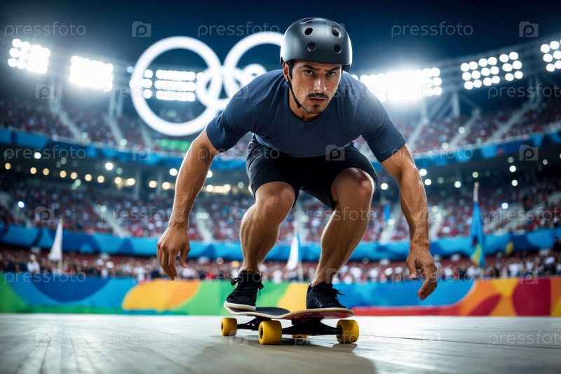 ИИ Генеративный Человек спортсмен скейтбордист, катающийся в скейт-парке на скейтбордах, летние Олимпийские игры соревнования