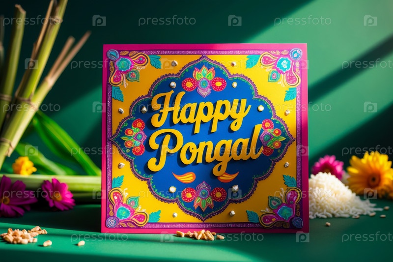 Pongal Traditional India festive Holiday Greeting Card on Colored Background with Food AI Generative Праздничная традиционная индийская праздничная открытка на цветном фоне с продуктами питания