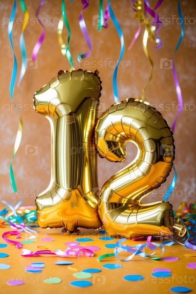 Гелиевый день рождения шарик формы номер двенадцать, золотые буквы фигура 12 праздник праздничный фон
