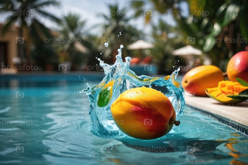 AI Generative Экзотические фрукты манго в распыленной воде на летнем бассейне отдых фоном