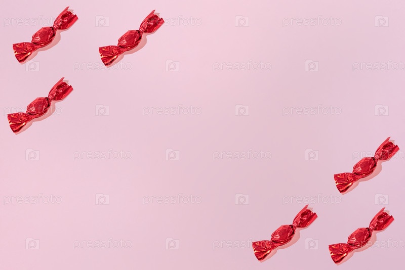 Творческий праздничный шаблон с красными шоколадами на розовом фоне Копировать пространство для текста