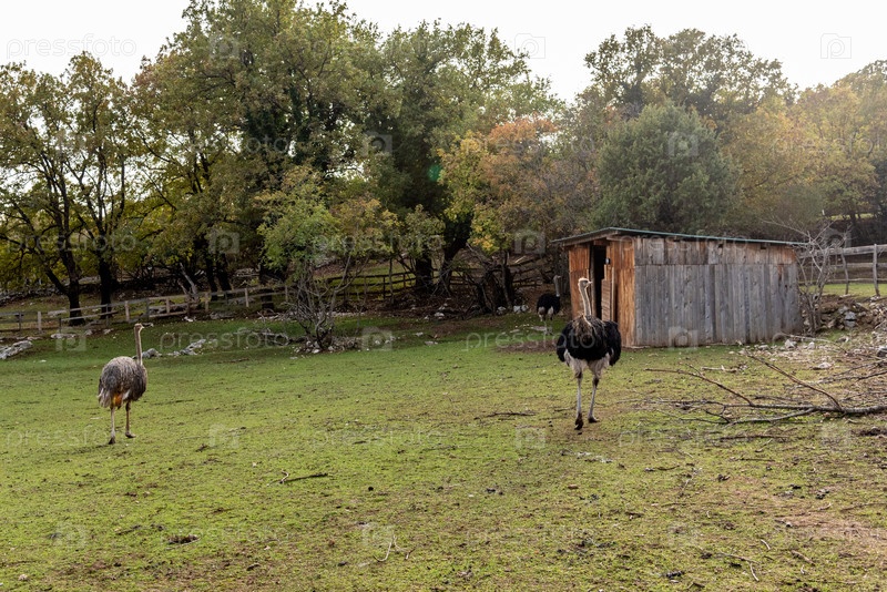 Домашний страус эму ходит по просторной конюшне на ферме, животные домашние питомцы пасутся снаружи