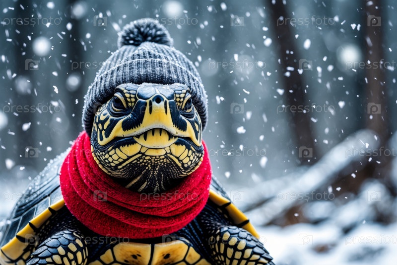 Портрет черепахи в вязанной зимней одежде шляпе и шарфе, животное в снежных дождях зимой AI Generative