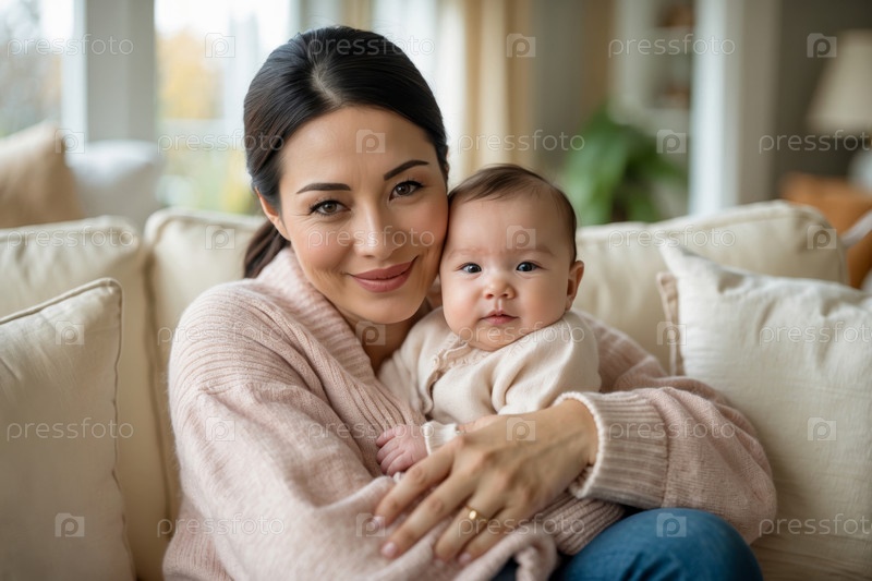Семейный портрет Мама и новорожденный ребенок, женщина и ребёнок обнимаются в гостиной дома AI Generative