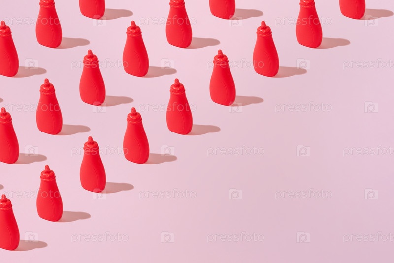 Творческий томатный кетчуп барбекю соус абстрактный рисунок плоский укладка на пастельно-розовом фоне с копировальным пространством для текста